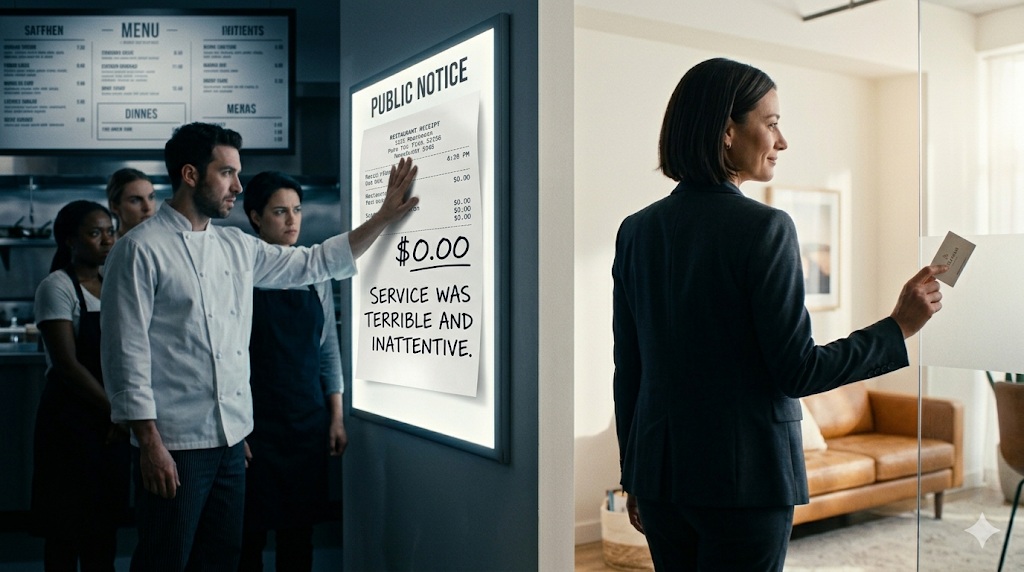 The receipt I left at Pescara, a seafood restaurant in the Gulch neighborhood of Nashville, on the night of my engagement anniversary in October, read: "Service was cold the moment we sat down. Our drinks took 45 minutes. Our apps were 'forgotten.' You rolled your eyes when we ordered dessert. You brought the wrong check twice. Every straight couple at the surrounding tables got warmer service than we did. We know what this was. Tip: $0. Understand why." I signed it. I wrote